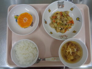 今日の給食は、豚玉丼・みそ汁・ブロッコリーサラダ・りんごです。