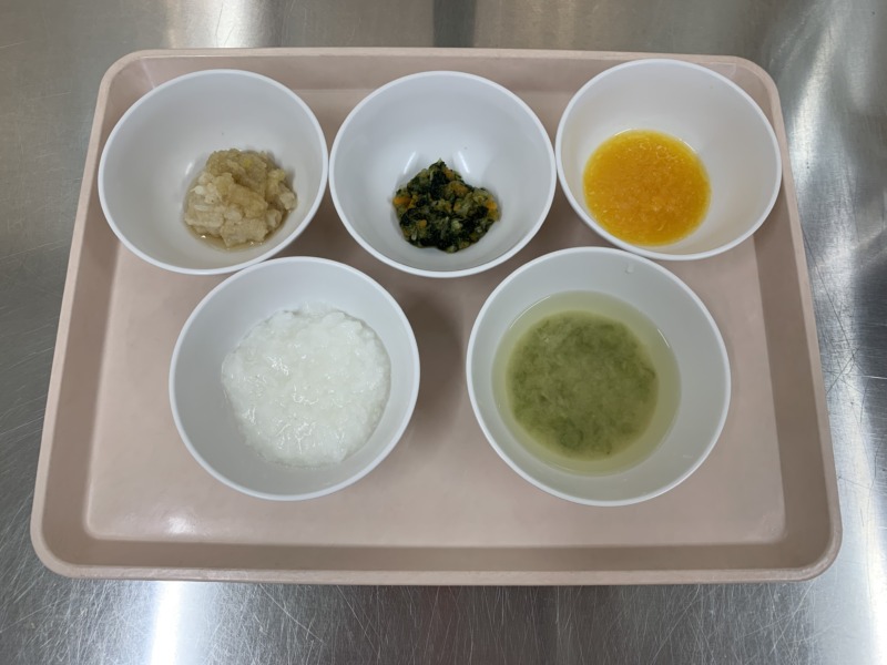 離乳食中期は、米がゆ・みそ汁・タラの香味煮・白菜サラダ・みかんです。