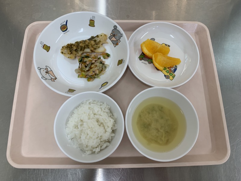 今日の給食は、ご飯・みそ汁・タラの香味焼き・ハムサラダ・オレンジです。