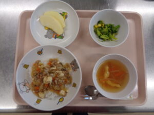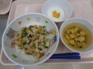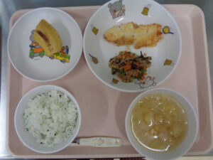 今日の給食は、納豆ご飯・みそ汁・肉じゃが・バナナです。