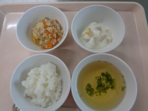 離乳食(後期)は、ごはん・鶏肉じゃが丼・野菜スープ・ヨーグルト和えです。