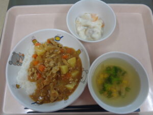 今日の給食は、ポークカレー・コンソメスープ・ヨーグルト和えです。