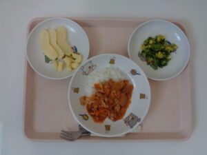 今日の給食は、ハヤシライス・ブロッコリーサラダ・鉄カルシウム強化チーズ・りんごです。
