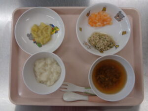 離乳食(中期)は、パンがゆ・スープ・野菜入りハンバーグ・野菜スティック・バナナです。