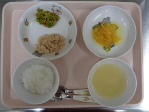 離乳食(中期)は、おかゆ・みそ汁・肉団子・煮野菜・みかん缶です。