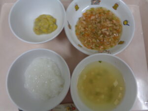 離乳食(中期)は、おかゆ・みそ汁・鮭の野菜和え・バナナです。