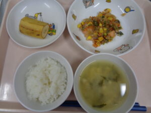 今日の給食は、ごはん・みそ汁・鮭のマヨネーズ焼き・バナナです。
