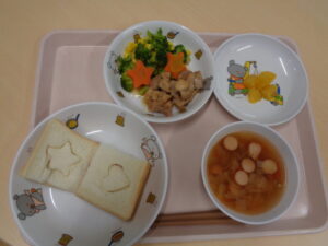 そこで、今日の給食はクリスマスバージョンで、食パン・ミネストローネ・照り焼きチキン・コンソメ炒め・みかんです。