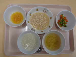 離乳食(中期)は、パンがゆ・スープ・鶏のとろとろ煮・コロコロ野菜・みかんです。