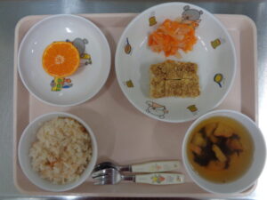 今日の給食は、鮭ごはん・すまし汁・松風焼き・なます風・みかんです。