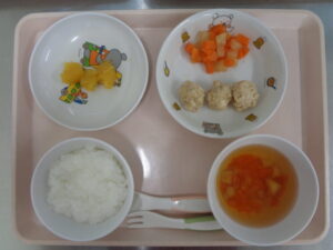 離乳食(後期)は、軟飯・すまし汁・豆腐入り肉団子・コロコロ野菜・みかんです。