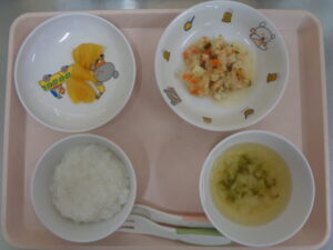 離乳食(後期)は、軟飯・みそ汁・カレイの野菜和え・みかんです。