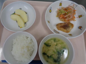今日の給食は、ごはん・みそ汁・カレイのマヨチーズ焼き・ベーコンサラダ・オレンジです。
