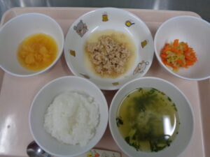 離乳食(後期)は、鶏そぼろ丼・みそ汁・煮野菜・みかんです。
