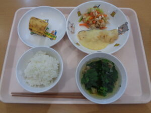 今日の給食は、ごはん・すまし汁・タラのみそチーズ焼き・バンバンジーサラダ・バナナです。