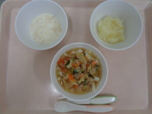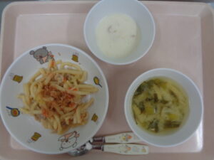 今日の給食は、焼きうどん・具だくさんみそ汁・ヨーグルト和えです。