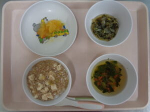 離乳食(後期)は、麻婆丼(軟飯)・スープ・わかめ煮・みかんです。