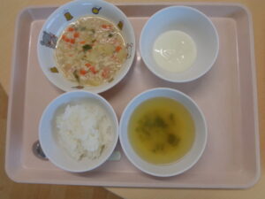 今日の給食は、ごはん・みそ汁・鶏じゃが・ヨーグルトです。