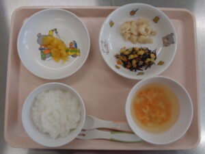 離乳食(後期)は、軟飯・みそ汁・カレイの照り煮・ひじき煮・みかんです。