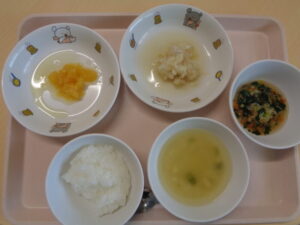 離乳食(後期)は、軟飯・みそ汁・タラの香味煮・煮野菜・みかんです。