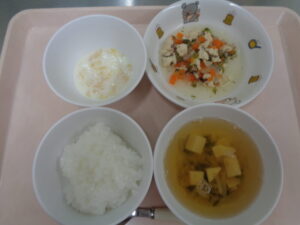 今日の給食は、中華丼・具だくさんスープ・みかんヨーグルトです。